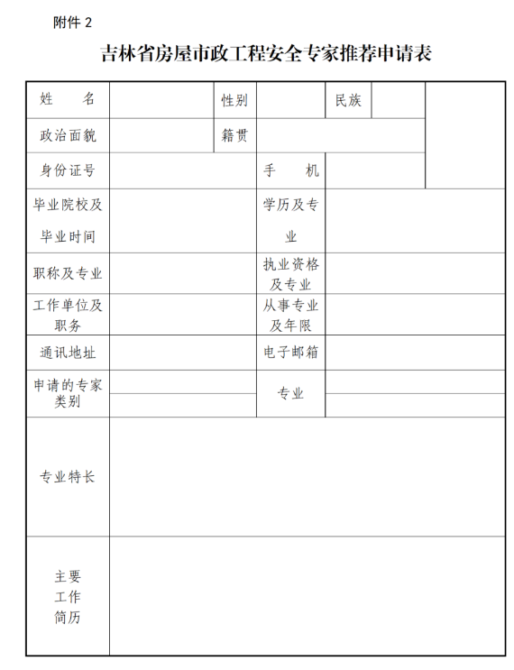 附件2:吉林省房屋市政工程安全专家推荐申请表