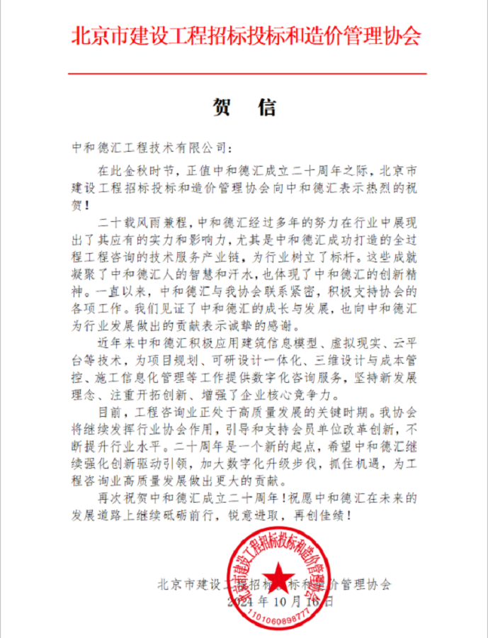 2024年10月16日,正值开云集团成立20周年之际,公司又收到了北京市建设工程招标投标和造价管理协会的热烈祝贺。这封贺信不仅是对我们过去20年辛勤付出和卓越成就的肯定,更是对我们未来发展提出了更高的期望。我们将全力以赴在京标价协工作指导下,积极参与行业合作,提升技术创新能力,为业主提供更加优质的服务,共同为推动工程咨询行业的健康发展贡献力量。